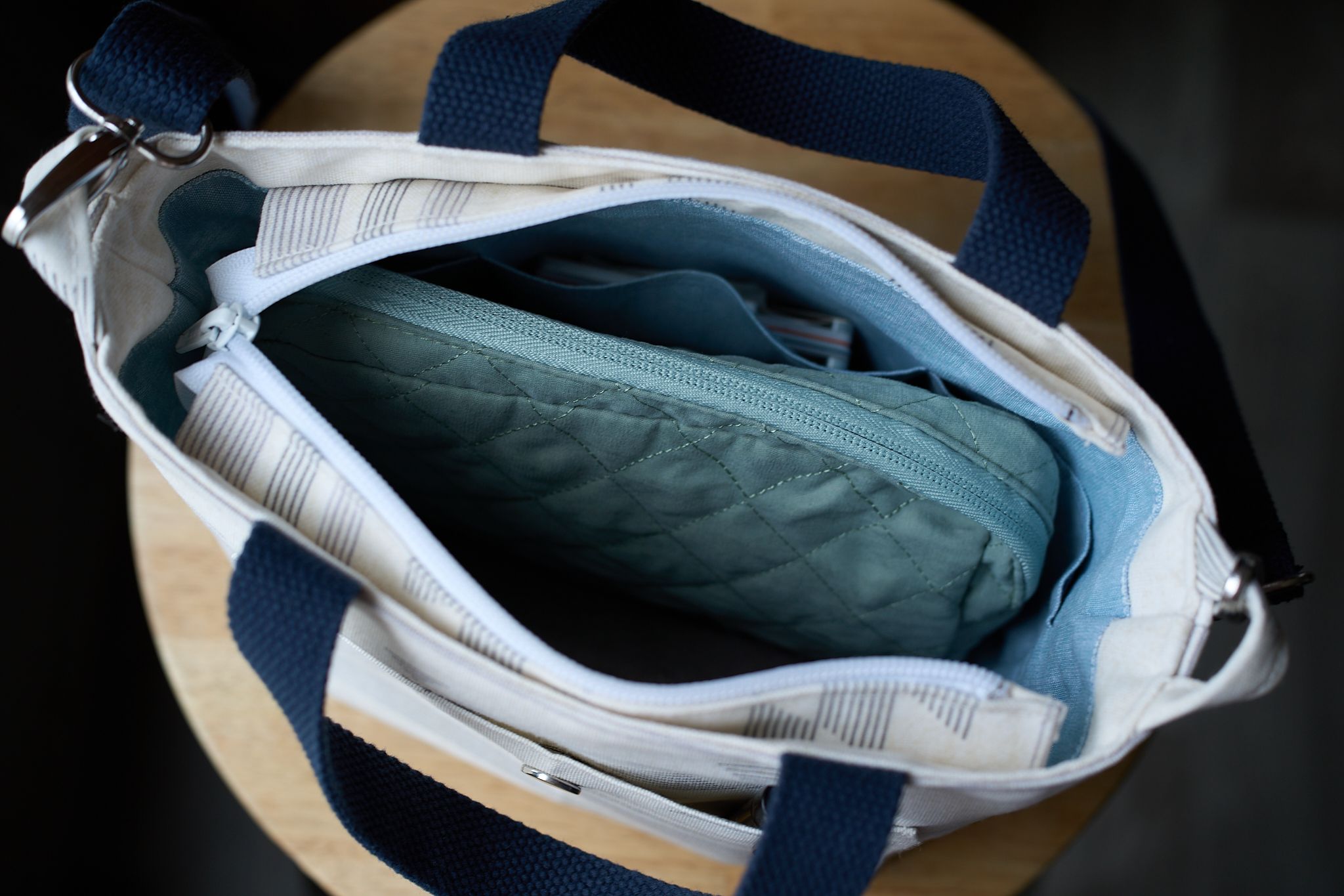 The exterior of the bag was constructed with an outdoor cotton canvas fabric I had purchased a while back. The interior, a chambray blue cotton.